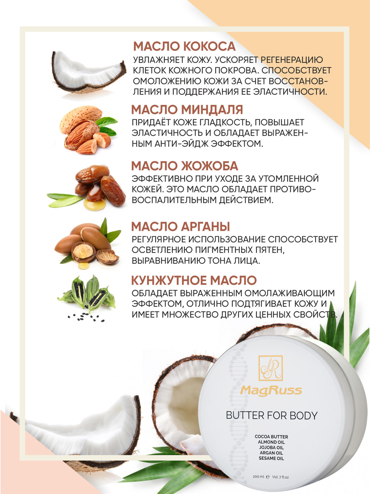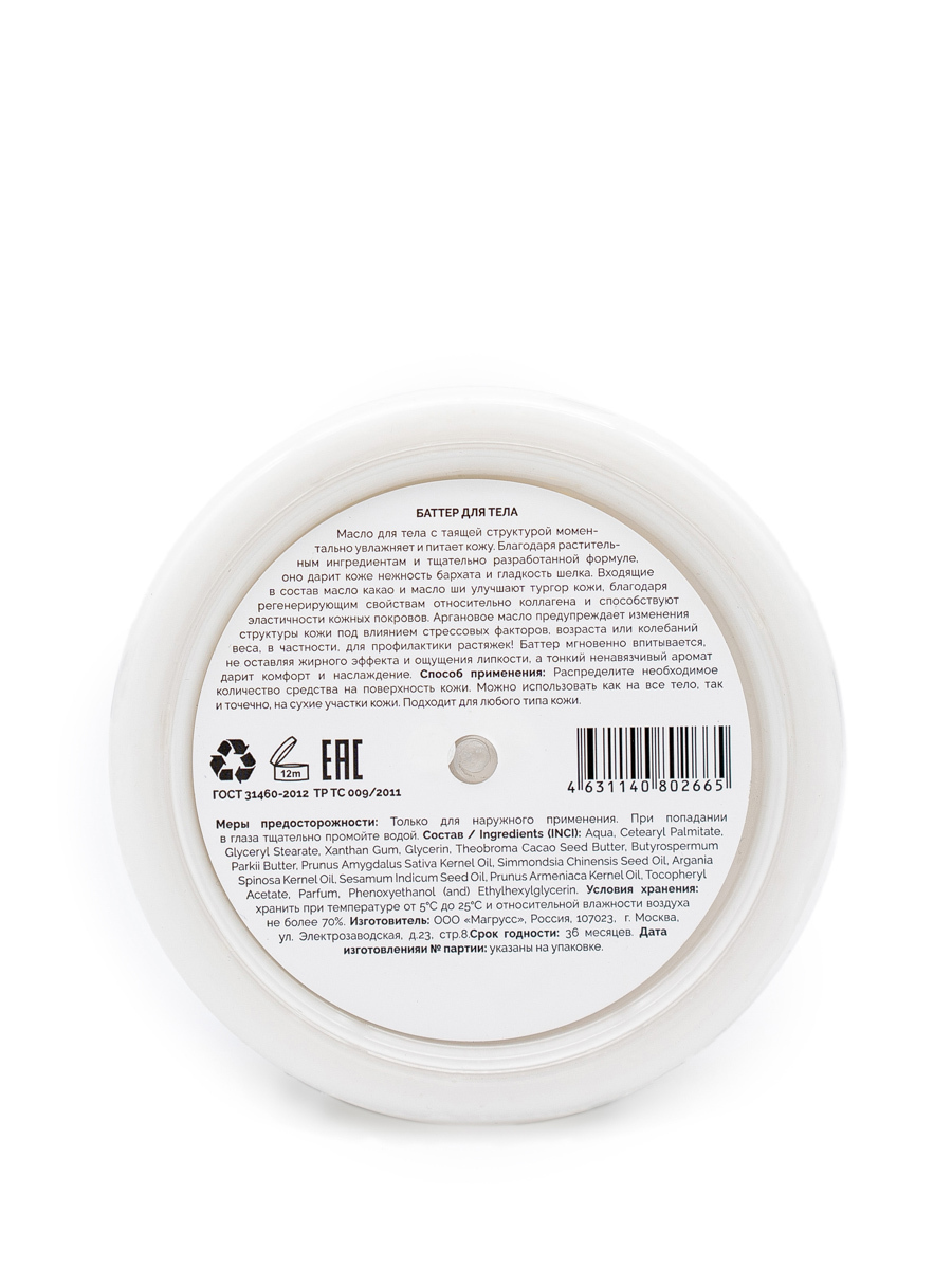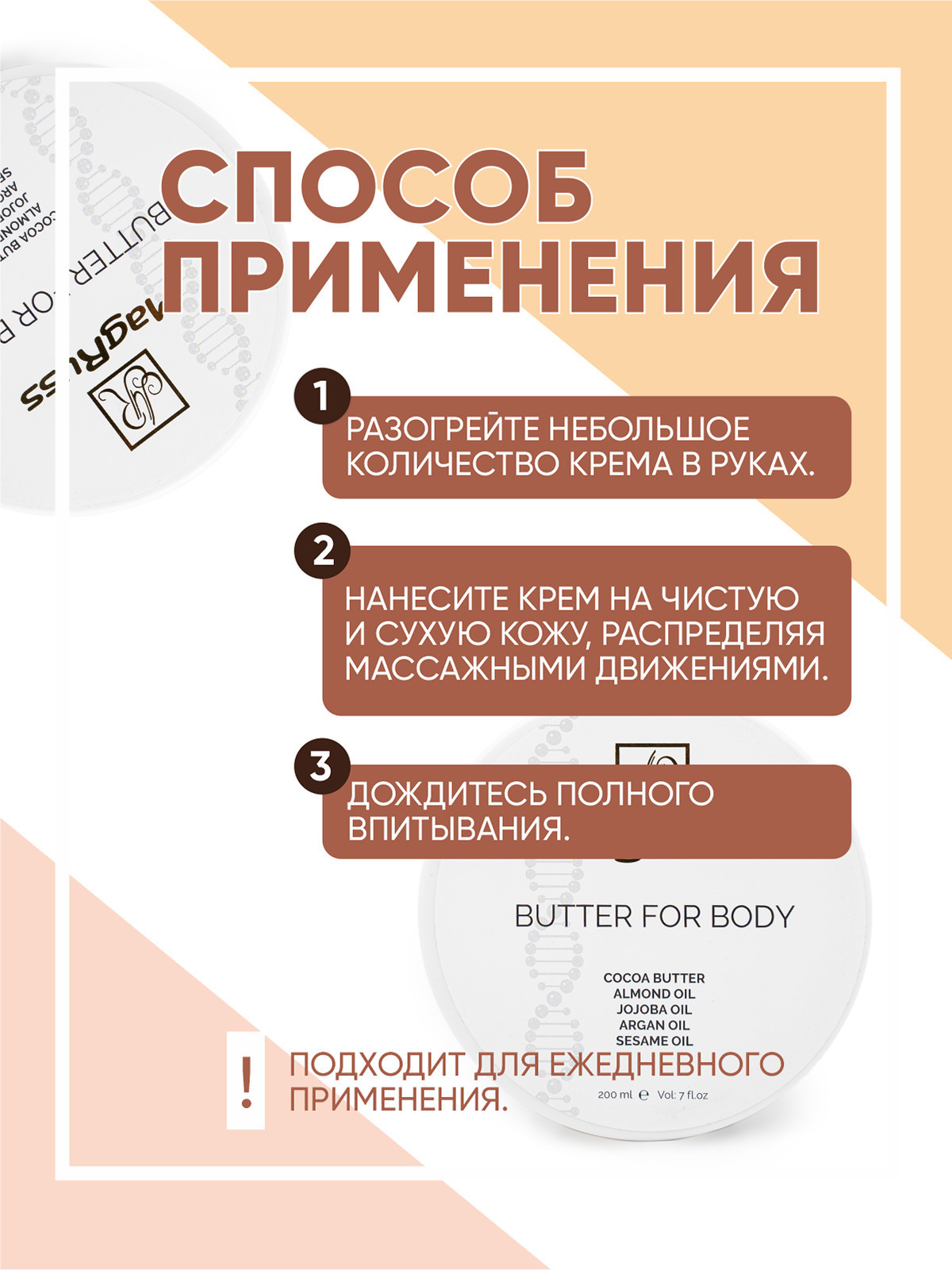 Возьмите за правило каждый день баловать себя и свое тело ароматной терапией. Наносите нежный баттер на сухую чистую кожу, плавно распределяя его массажными движениями. Не спешите, прочувствуйте нежный аромат персика и напитайте каждый сантиметр своего тела драгоценными компонентами . Уже через несколько применений Ваше тело отблагодарит Вас мягкостью и невероятной упругостью. И тогда боди баттер от MagRuss надолго поселится в Вашей ванной комнате, став незаменимой составляющей Вашего ежедневного ухода.