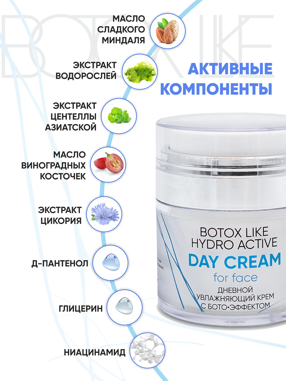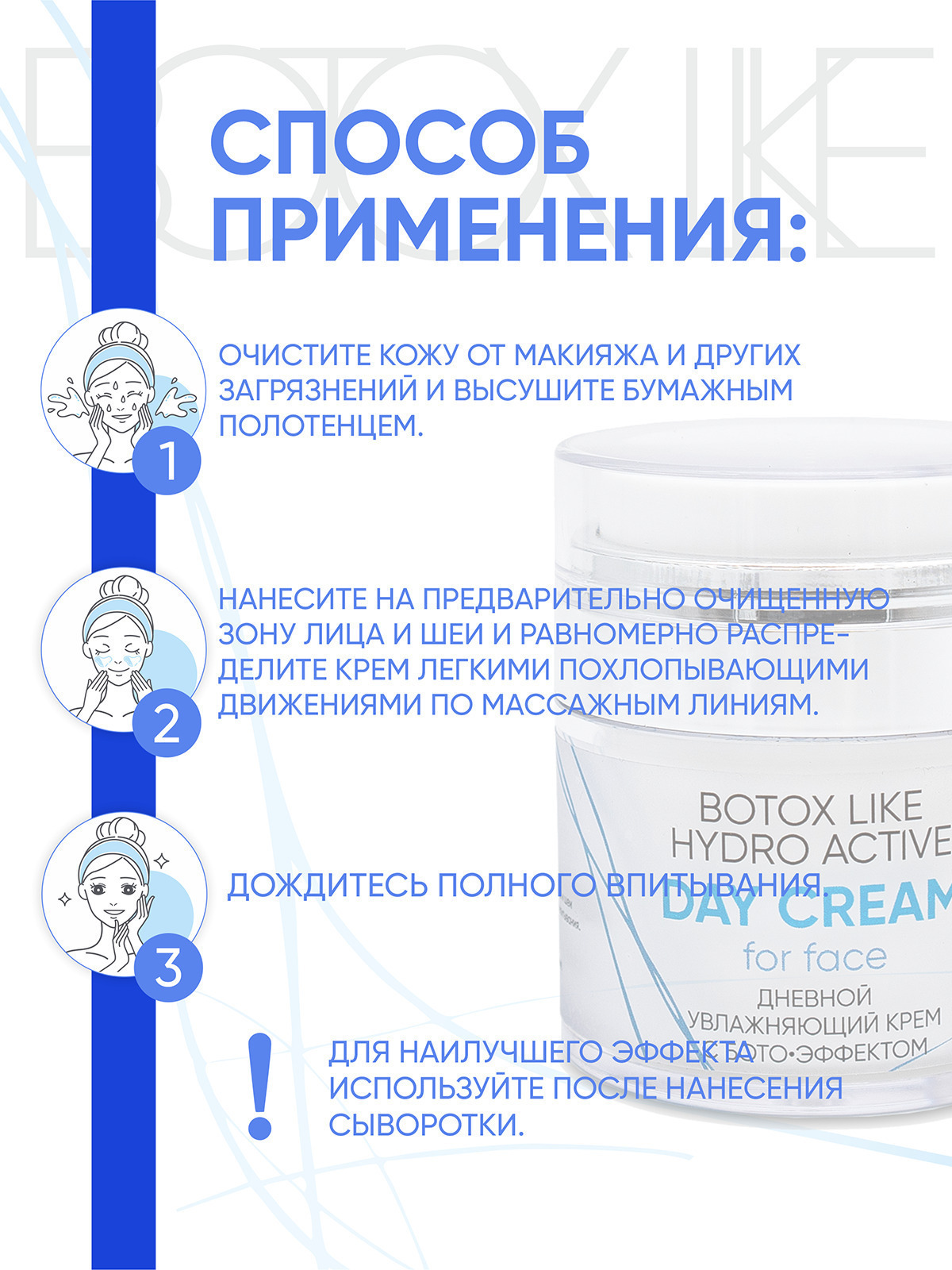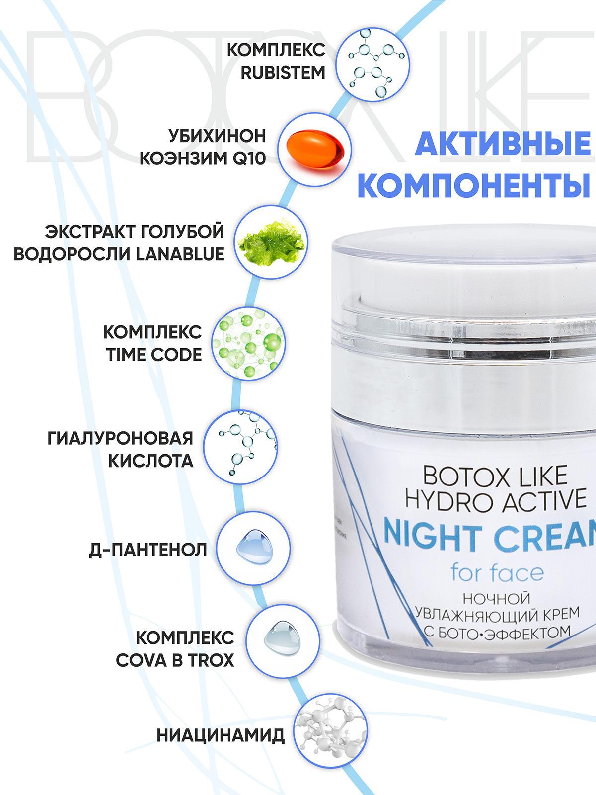 Увлажняющий крем с лифтинг-эффектом для кожи любого типа. Благодаря ботоэффекту актива Cova b trox крем способствует сокращению морщин и препятствует образованию новых. Он повышает упругость, эластичность и плотность кожи, делает контур лица подтянутым, улучшает цвет лица. Что вы получаете в итоге? Ваша кожа выглядит заметно более молодой, «отдохнувшей» и сияющей.