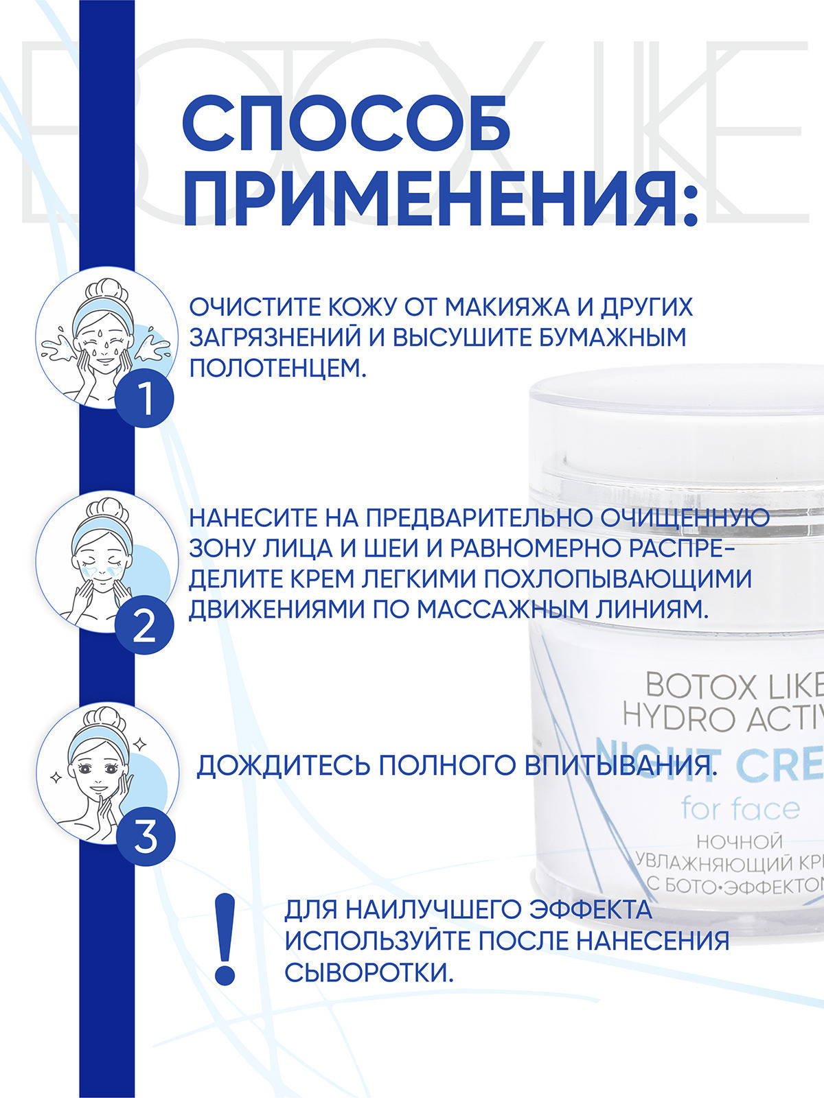 Легкими движениями нанесите крем на сухую чистую кожу лица и шеи. Помассируйте кожу до полного впитывания средства. Рекомендуем применять крем ежедневно вечером.