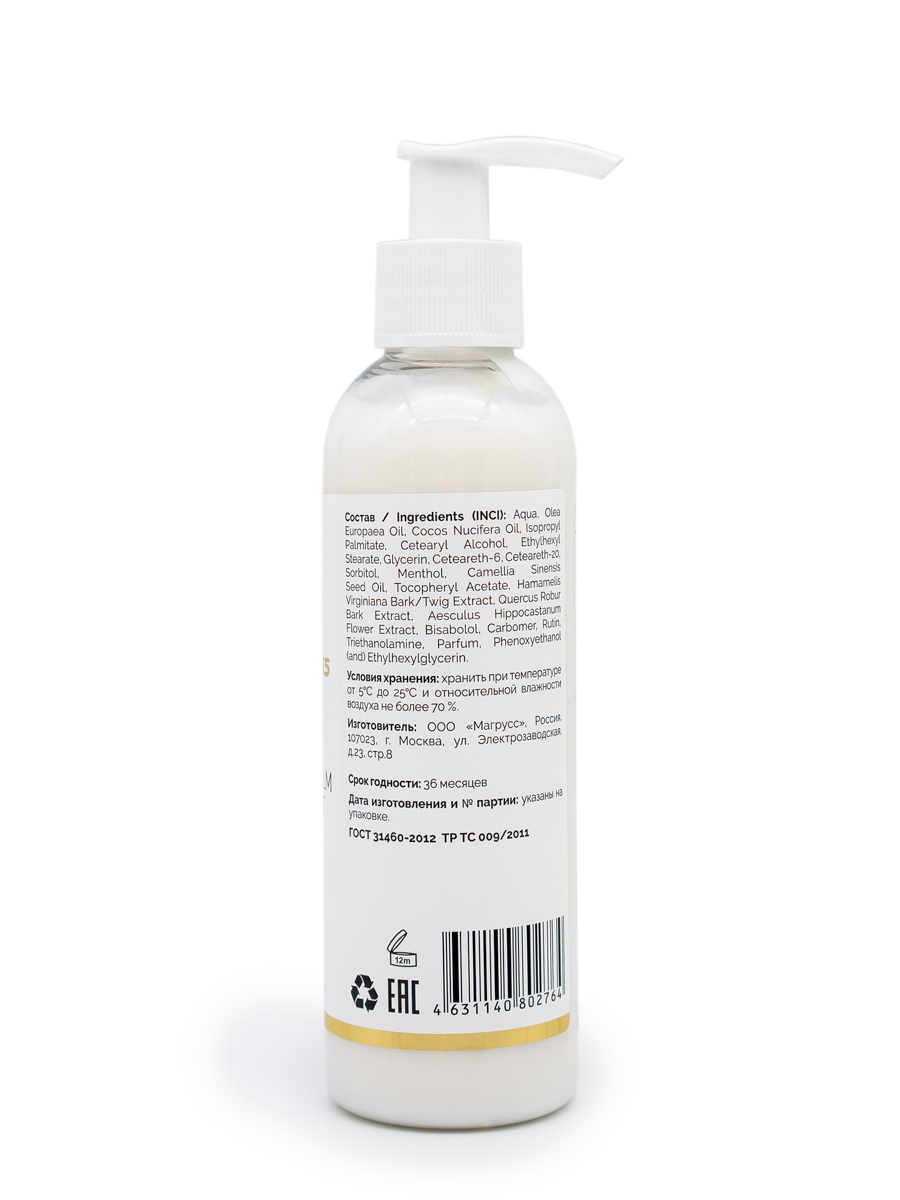 Aqua, Olea Europaea Oil, Cocos Nucifera Oil, Isopropyl Palmitate, Cetearyl Alcohol, Ethylhexyl Stearate, Glycerin, Ceteareth-6, Ceteareth-20, Sorbitol, Menthol, Camellia Sinensis Seed Oil, Tocopheryl Acetate, Hamamelis Virginiana Bark/Twig Extract, Quercus Robur Bark Extract, Aesculuc Hippocastanum Flower Extract, Bisabolol, Carbomer, Rutin, Triethanolamine, Parfum, Phenoxyethanol (and) Ethylhexylglicerin.
