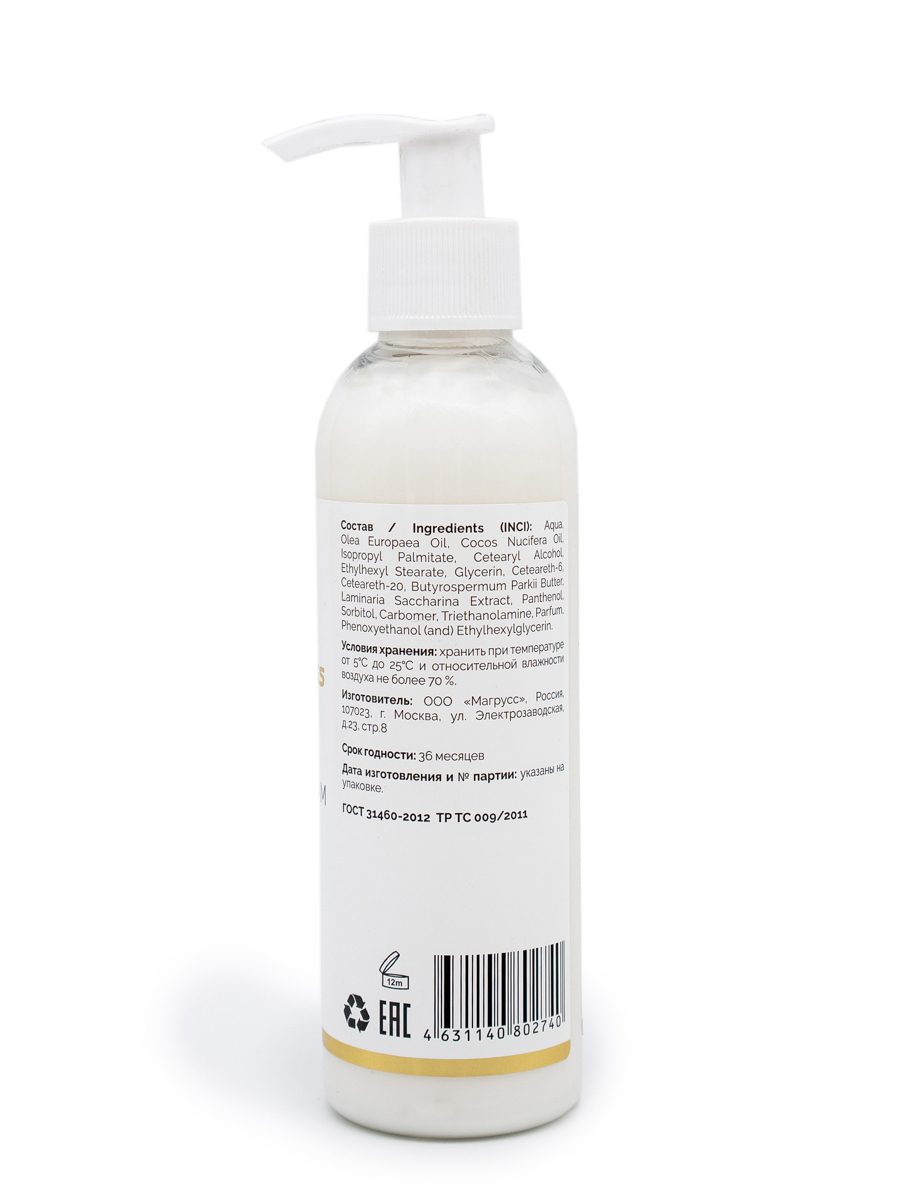 Aqua, Olea Europaea Oil, Cocos Nucifera Oil, Isopropil Palmitate,Cetearyl Alcohol, Ethylhexyl Stearate, Glycerin, Ceteareth-6, Ceteareth-20, Butirospermum Parkii Butter, Laminaria Saccharina Extract, Panthenol, Sorbitol, Carbomer, Triethanolamine, Parfum, Phenoxiathanol (and) Ethylhexilglycerin.