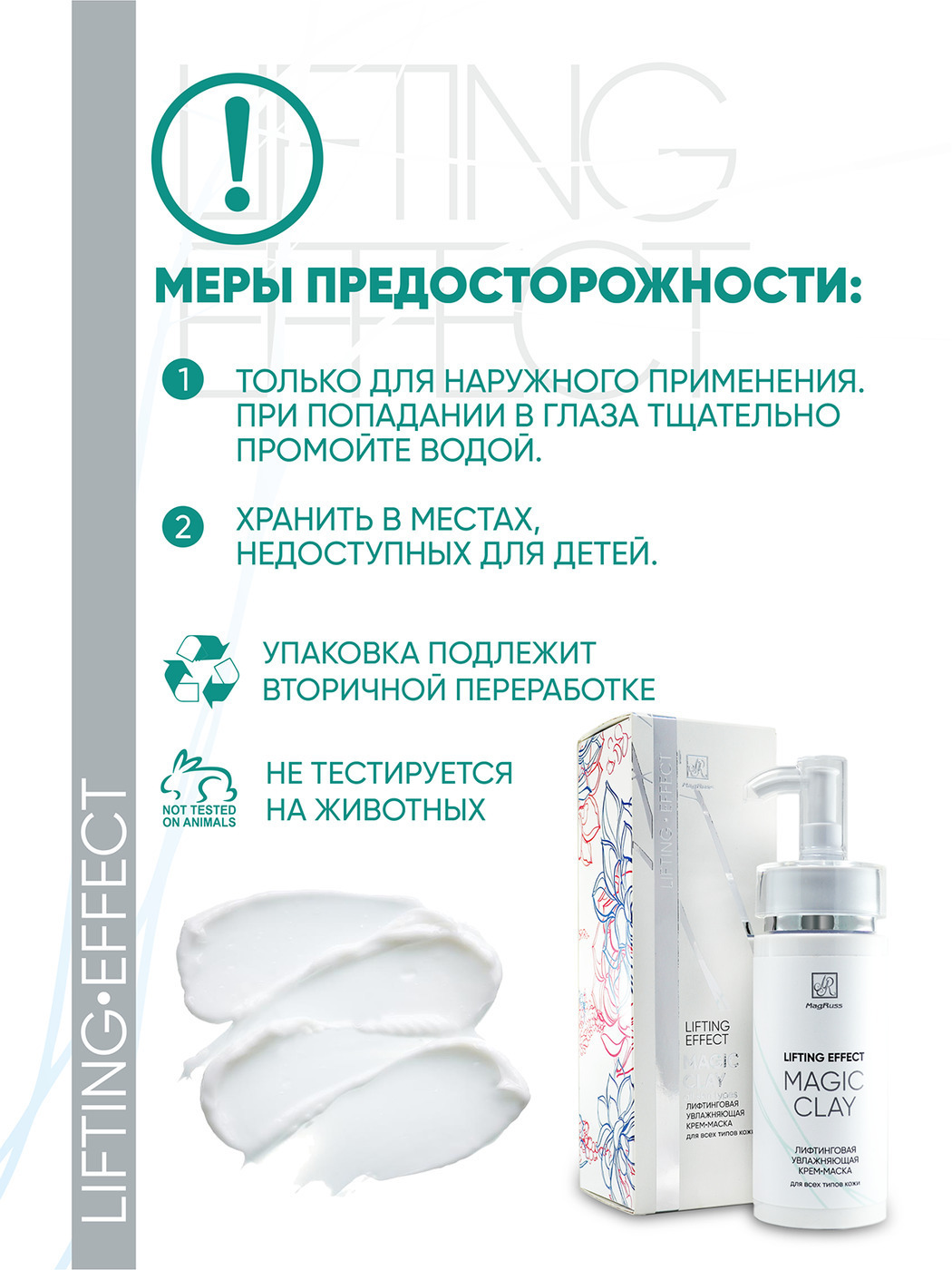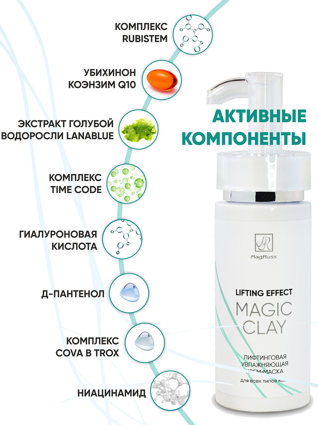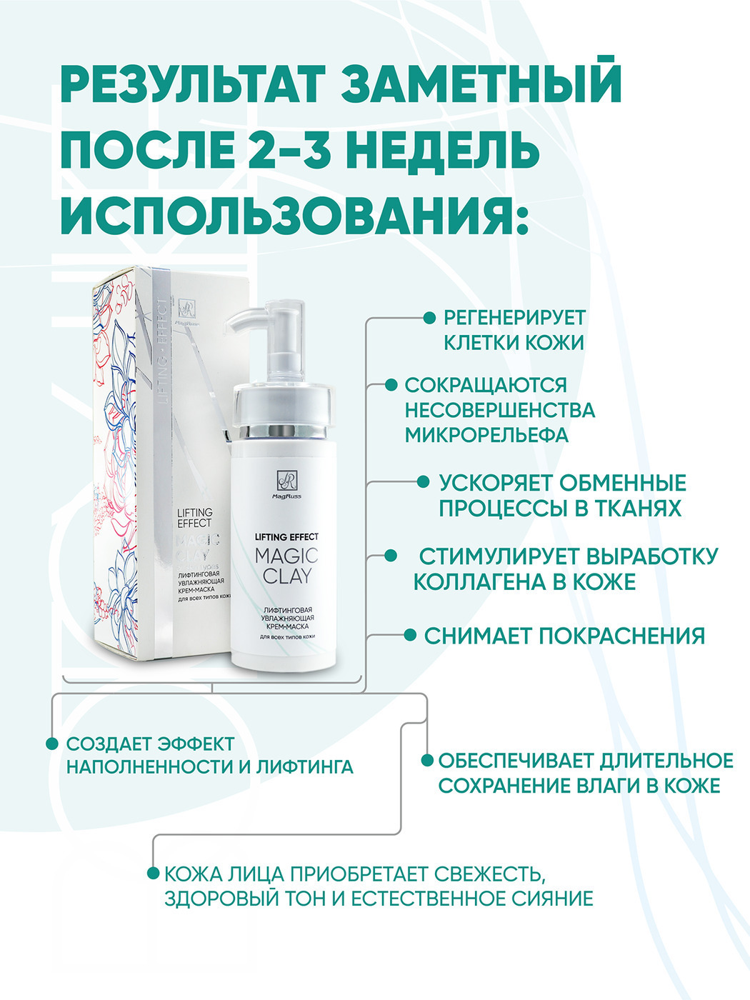 Что нужно коже для поддержания красоты и молодости? Качественное увлажнение! Крем маска Magic Clay с лифтинг-эффектом глубоко питает и заметно улучшает внешний вид лица, препятствуя появлению возрастных изменений кожи. Гиалуроновая кислота снимает сухость и раздражение, препятствует испарению влаги, обеспечивает упругость и гладкость кожи. Активные комплексы RUBISTEM, TIME CODE и COVA B TROX поддерживают естественные защитные функции кожи, сокращают несовершенства микрорельефа, выравнивают тон, омолаживают. В результате кожа лица приобретает свежесть, здоровый тон и естественное сияние.