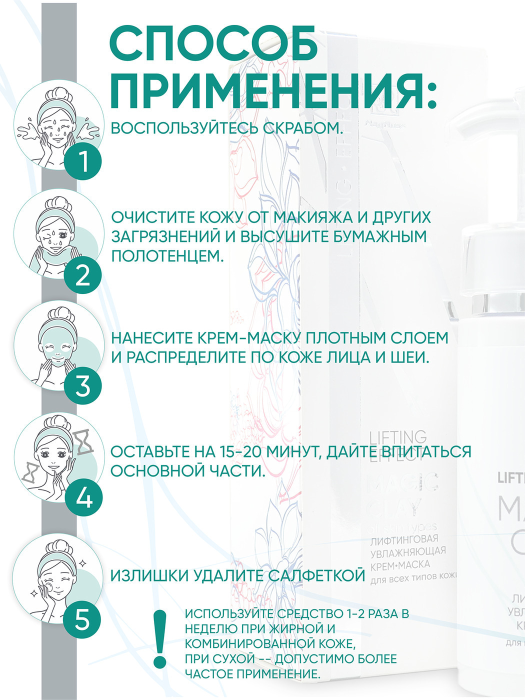 Нанесите маску на лицо и шею, при этом не допускайте попадания на область вокруг глаз. Время экспозиции составляет 15-20 минут. Смойте маску теплой водой, протрите кожу влажными дисками, предварительно смоченными увлажняющим тоником. Рекомендуем использовать маску в сочетании с дневным или ночным кремом.