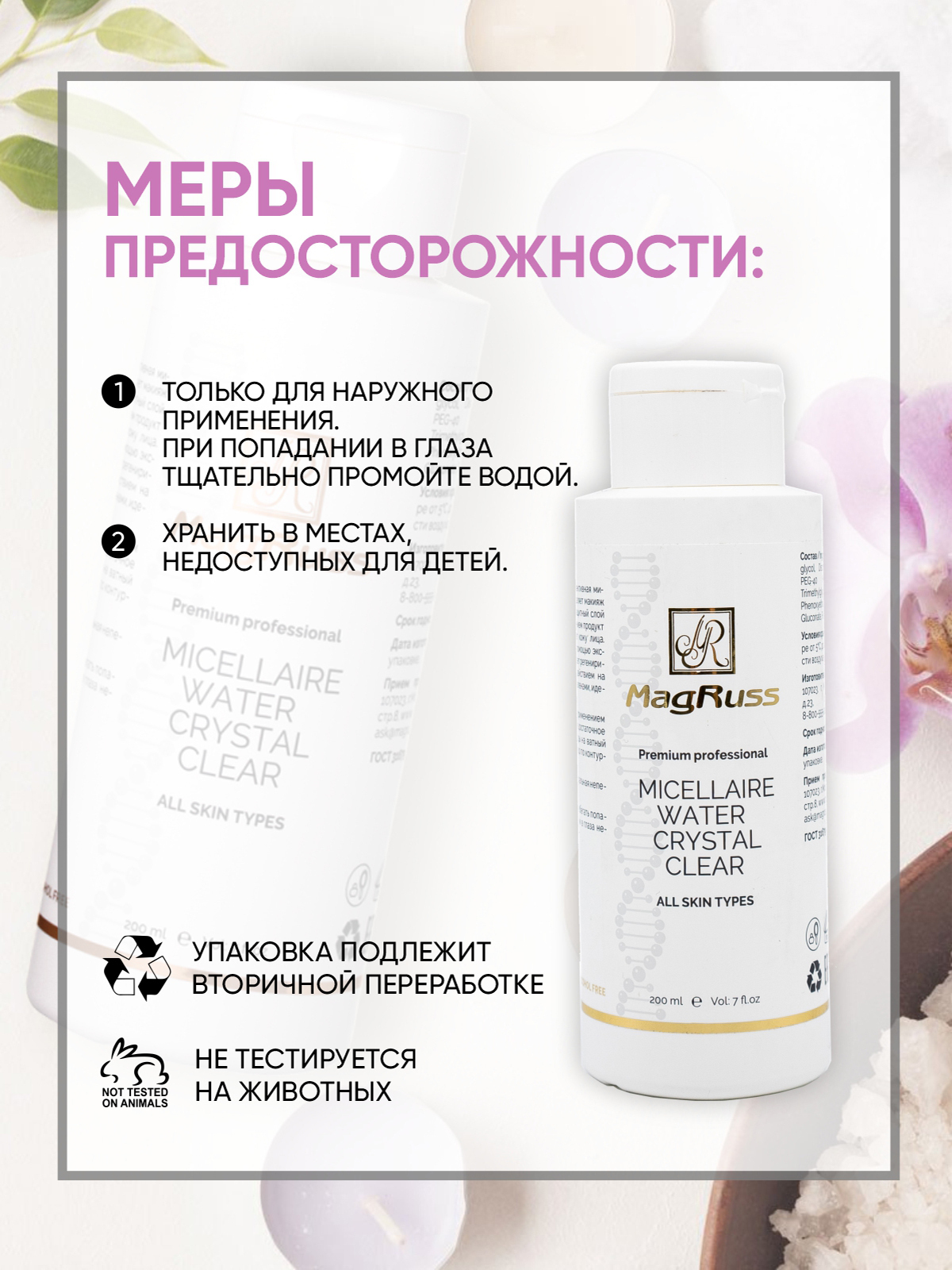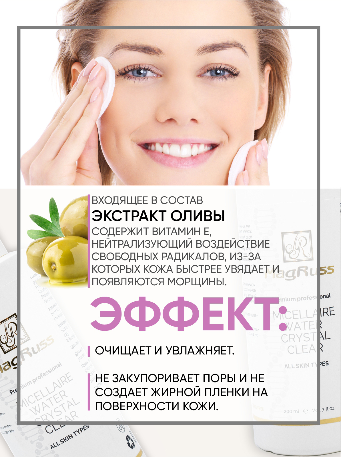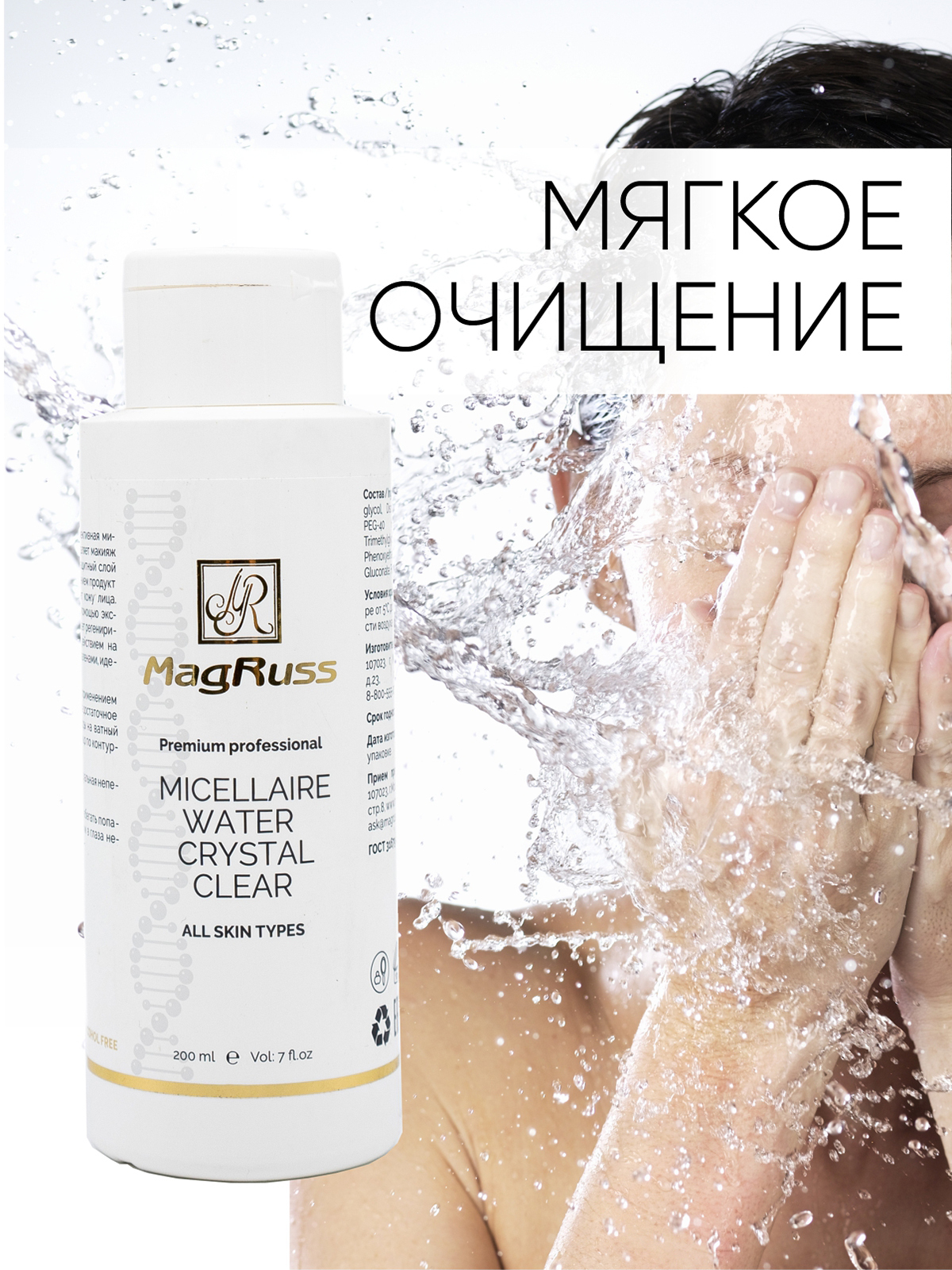 Впервые за свою историю Magruss представляет мицеллярную воду для всех типов кожи. Это очищающее средство с мицеллами, которые обволакивают частицы макияжа, пыли, кожного жира и удерживают их внутри себя. Легко удаляются при помощи ватного диска. Раствор с мицеллами действует максимально мягко, не повреждая эпидермис. Это отличное средство ухода за проблемной кожей. Мицеллярная вода очищает и увлажняет, не закупоривая поры и не создавая жирной пленки на поверхности кожи.
