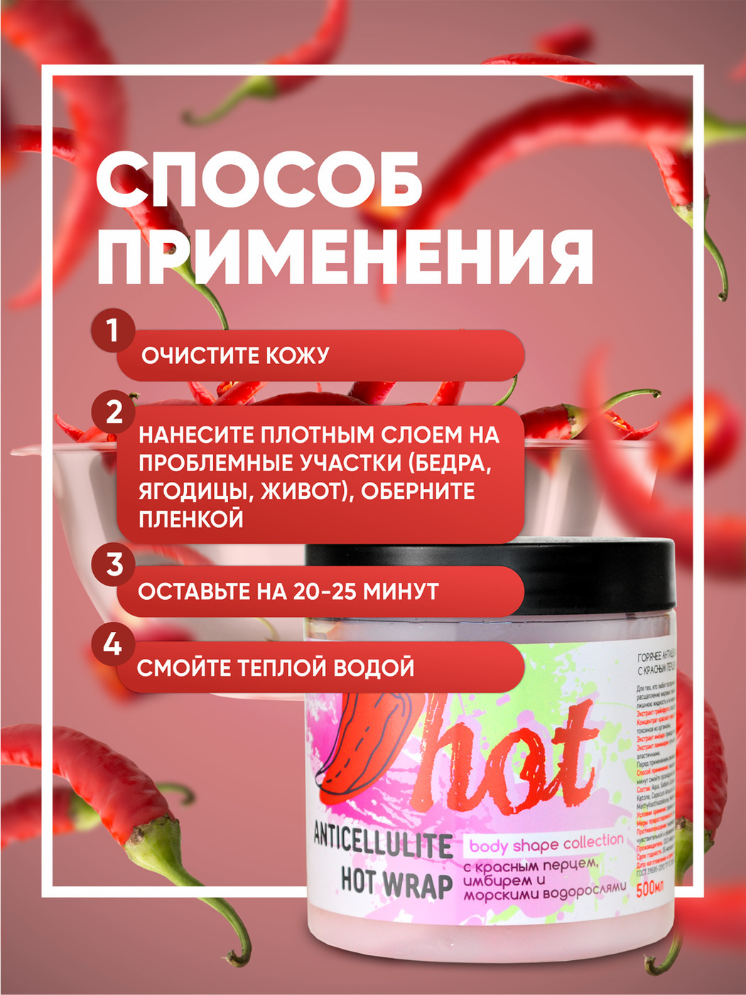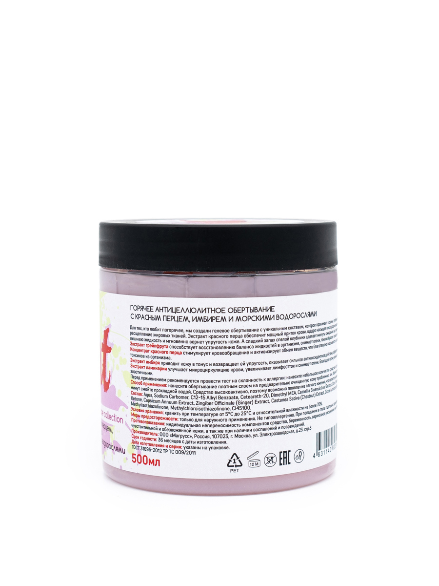 Для тех, кто любит погорячее, мы создали гелевое обертывание с уникальным составом, которое проникает в самые глубокие слои кожи и активизирует ускоренное расщепление жировых тканей. Экстракт красного перца обеспечит мощный приток крови, щедро насыщая кислородом каждую клеточку твоего тела. Имбирь выведет всю лишнюю жидкость и мгновенно вернет упругость коже. А сладкий запах спелой клубники сделает минуты ожидания еще приятнее.