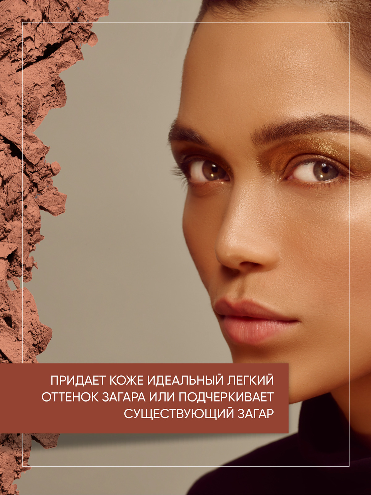 Пудра придает коже легкий оттенок загара или подчеркивает существующий загар. При использовании матового бронзатора без перламутра удается получить максимально натуральный тон кожи, который выглядит благородно и сдержанно. Нанесение такого бронзатора будет уместным даже в дневном макияже.