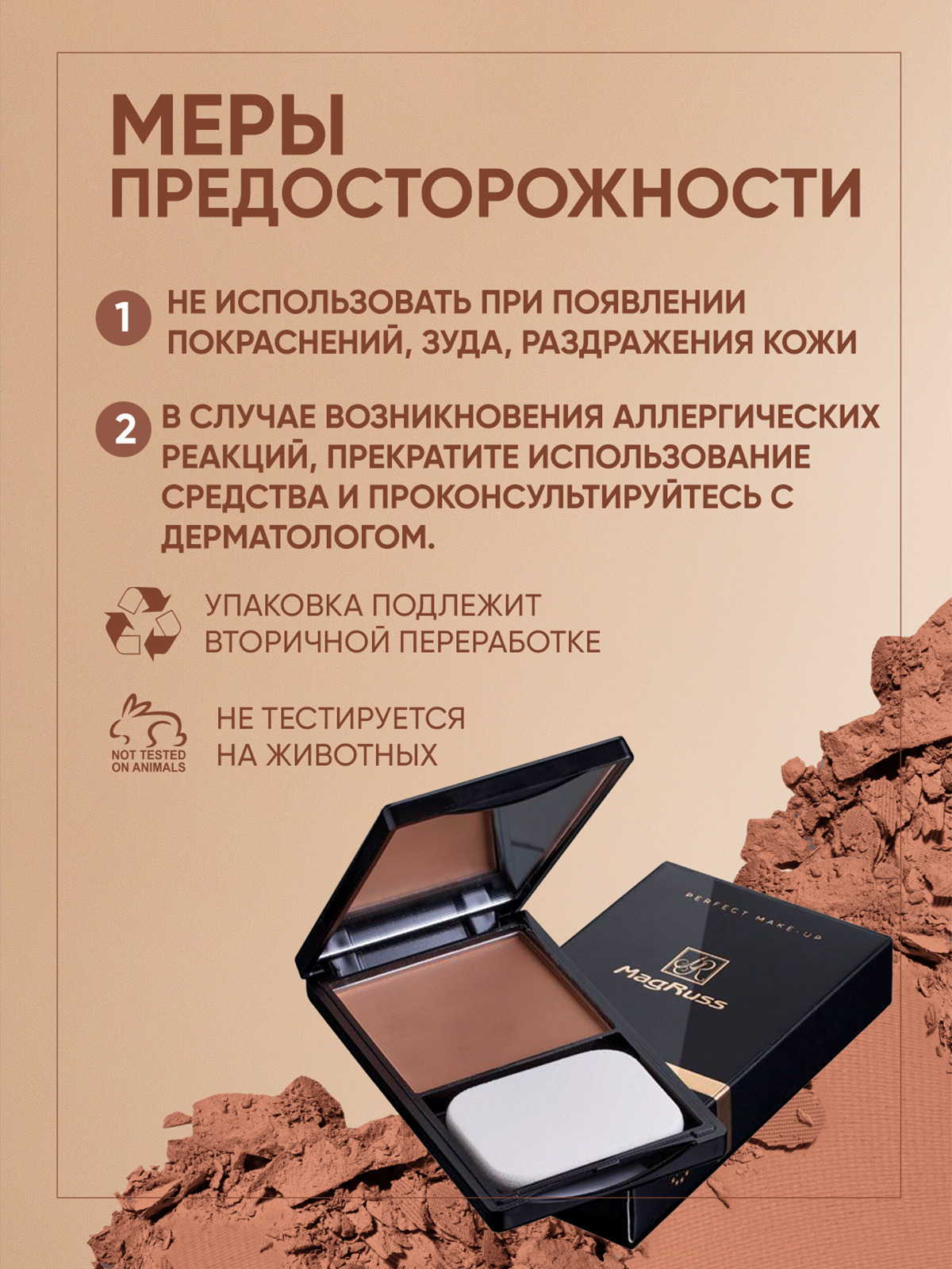 Средство легко наслаивается до необходимой интенсивности цвета. Может наноситься как на все лицо, так и на отдельные зоны или выступающие части лица. Кроме того, оно может применяться для коррекции формы лица, придания ему бОльшей естественности и создания красивого рельефа.