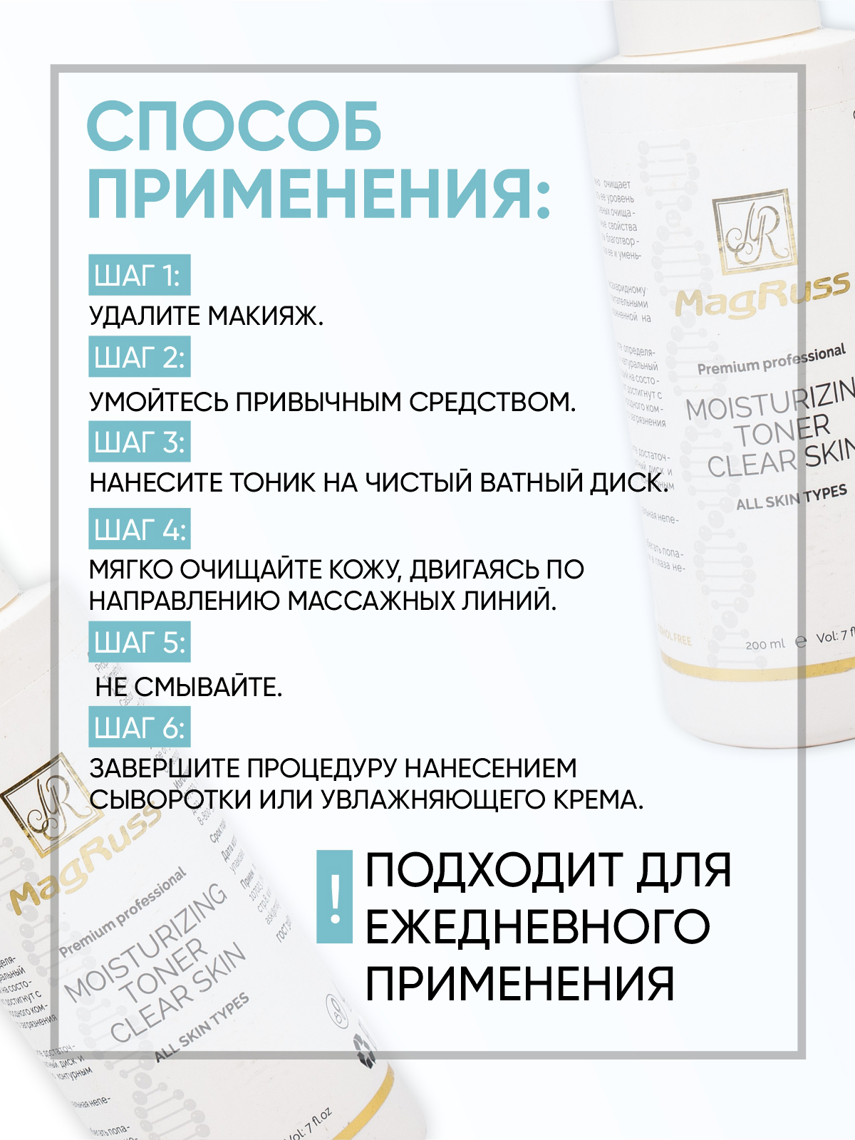 Тоник Magruss подходит для всех типов кожи, в том числе и чувствительной. Особенно рекомендуется для сухой и обезвоженной кожи. Желательно использовать его на завершающем этапе очищения и в качестве подготовки к основному уходу.