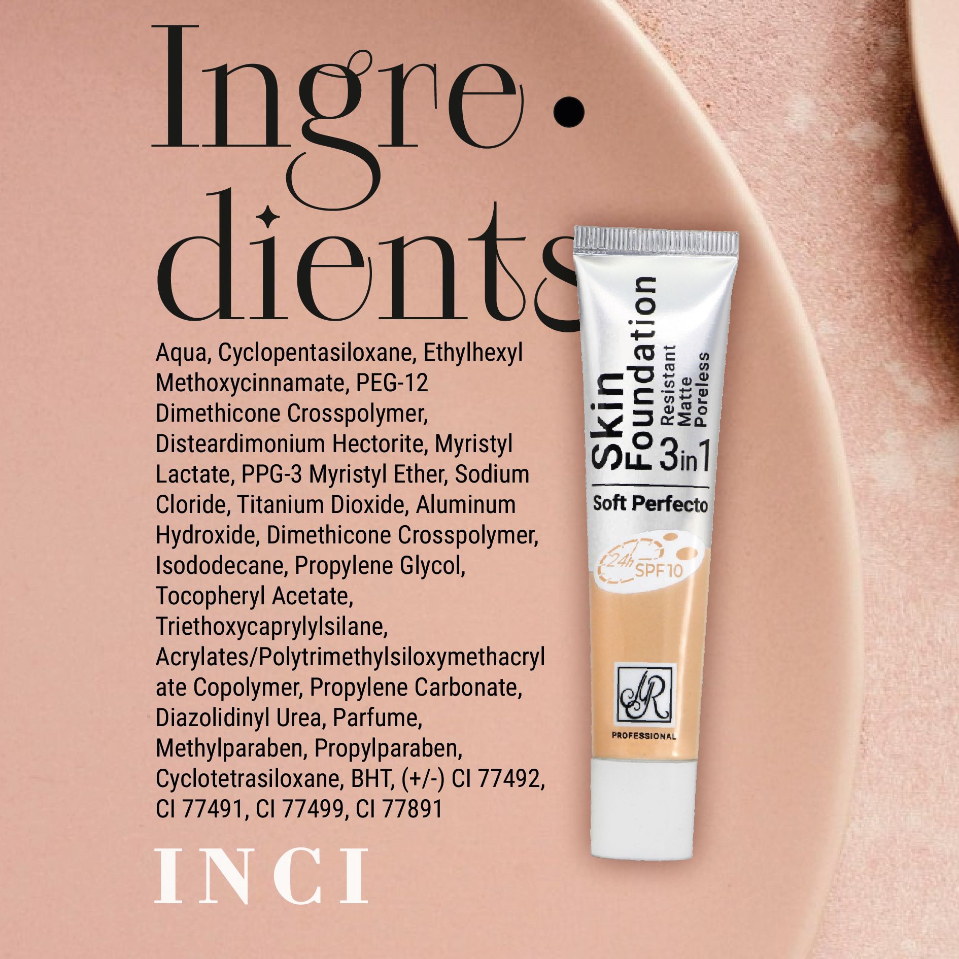 Aqua, Cyclopentasiloxane, PEG-12 Dimethicone Crosspolymer, Polymethylsilsesquioxane, Cyclohexasiloxane, Glycerin, Myristyl Lactate, PPG-3 Myristyl Ether, Sodium Chloride, Titanium Dioxide, Aluminum Hydroxide, Aloe Barbadensis Leaf Juice, Hydrogen Dimethicone, Tocopheryl Acetate, Propanediol, Isododecane, Propylene Glycol, Acrylates/Polytrimethylsiloxymethacrylate Copolymer, Triethoxycaprylylsilane, Panthenol, Hydroxyethyl Urea, Parfum, Cyclotetrasiloxane, Hydrated Silica, Linalool, Citronellol, (+/-) CI 77492, CI 77491, CI 77499, CI 77891